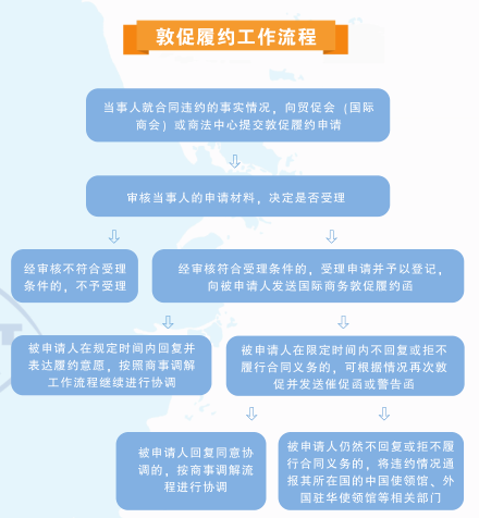 敦促履约,是指在经贸合作中,合同一方(被申请人)没有按照合同约定履行义务或者履行义务有瑕疵时,合同另一方(申请人)向法律服务中心提出申请,法律服务中心审查后,利用365bet注册网址_365游戏中心官网地址_365娱乐游戏是哪个公司贸促会在国内外建立起来的良好信誉和工作网络,直接向合同违约方(被申请人)发出敦促履约函,促使其在限期内尽快履行合同项下义务,从而达到维护申请人合法权益的目的。敦促履约这一纠纷解决方式具有费用低廉、形式灵活的优点,因此深受广大外贸企业欢迎。