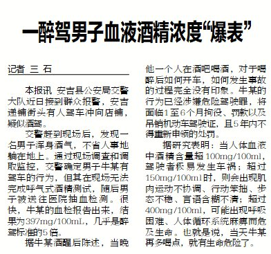 《湖州日报》:一醉驾男子血液酒精浓度爆表